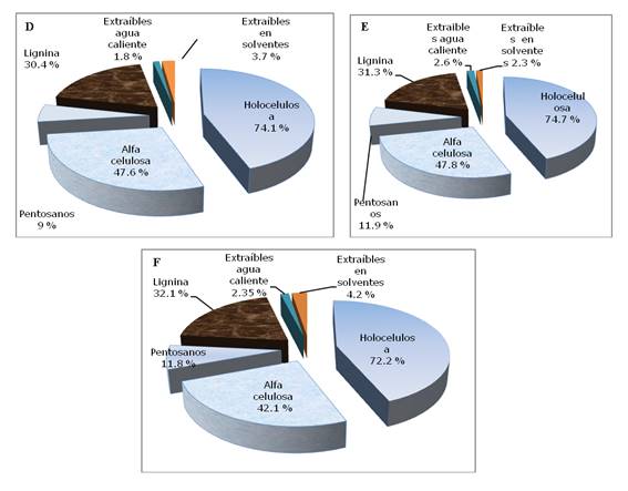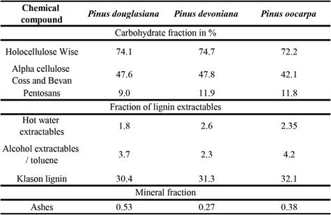 Respecto a la composición química de las diferentes fracciones de biomasa aprovechable para papel (madera) de las tres especies de pino, se observa (Cuadro 2 y Figura 12) que el porcentaje de holocelulosa fue superior en Pinus devoniana, con 74.7 % y en Pinus douglasiana, con 74.1 %.). Bernabé-Santiago et al. (2013) registran contenidos de holocelulosa en Pinus oocarpa (74.15 %), P. teocote Schiede ex Schltdl. et Cham. (71.54 %), P. michoacana (72.96 %), P. leiophylla Schiede ex Schltdl. et Cham. (69.16 %) y P. montezumae Lamb. (68.14 %), valores muy parecidos a los documentados en el presente trabajo, y dentro del intervalo (68 - 78 %) citado por Fengel y Wegener (1989) para diferentes pinos. Sin embargo, Boonstra (2006) consigna contenidos de 79 a 81 % para P. radiata D.Don y P. sylvestris L., superiores a los obtenidos en este estudio; dichos autores señalan que utilizaron el método Rowell, el cual difiere del método Wise, utilizado en la investigación que aquí se documenta.