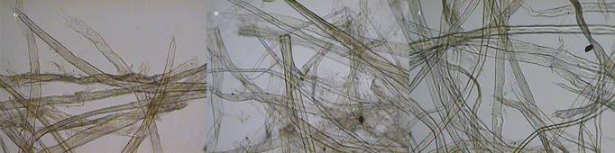 La preparación de muestras para medición de fibras y observación micrográfica (Figura 13), se hizo a partir de papel estándar con tratamiento de refinación (60 minutos). Los resultados indicaron que las fibras de P. devoniana presentan mayor fibrilación y flexibilidad (fibras dobladas), lo cual, normalmente, incrementa la superficie de contacto y la unión interfibrilar, lo que permite una mejor consolidación fibrilar y mayor resistencia fisicomecánica en el papel. Para el caso de las fibras de P. oocarpa y P. douglasiana no tuvieron el mismo efecto, además se observó que las de P. oocarpa presentaron la micro fibrilación y la flexibilidad más baja.