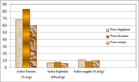 La evaluación de la resistencia fisicomecánica determinada en hojas de papel estándar, a partir de celulosa de cada una de las tres especies de pino (Cuadro 4, Figura 14), para P. devoniana presentó los mejores índices de resistencia fisicomecánica en tensión (83.1 N.m g-1) y explosión (7.6 kPa. m2 g-1). El papel de P. douglasiana tuvo su mejor propiedad de resistencia fisicomecánica en el índice de rasgado (10.8 N.m2 kg-1) y el de P. oocarpa registró las propiedades de resistencia más bajas en índice de tensión y explosión, aunque el índice de rasgado (9.9 N.m2 kg-1) fue superior al de P. devoniana (8.6 N.m2 kg-1).
