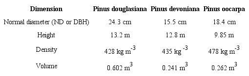 En el Cuadro 1 se observa que la medición dasométrica en las tres especies de pino indica que Pinus douglasiana tiene el mejor desarrollo, ya que presentó la mayor altura (13.2 m), DAP (24.3 cm) y volumen (0.602 m3) con respecto a los especímenes de los otros dos taxa. Pinus oocarpa, aunque con más densidad (478 kg m-3) y DAP (18.4 cm) que Pinus devoniana, registró la menor altura (9.85 m).