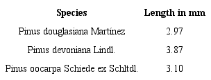 En la medición de fibras, mediante el análisis micrográfico (Cuadro 3), las de P. devoniana fueron las más largas (3.87 mm), con respecto a las de P. douglasiana (2.97 mm) y P. oocarpa (3.10 mm). Borja et al. (2001) midieron la longitud de fibra en P. caribea Morelet registraron un valor de 4.41 mm, superior a los del presente estudio; sin embargo, esto es normal, debido a que la variación de crecimiento se establece de acuerdo con la especie, tratamiento, así como de las condiciones climatológicas y topográficas.