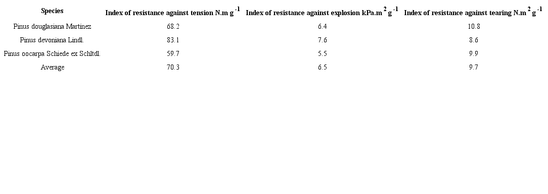 El análisis micrográfico y la determinación de propiedades fisicomecánicas en papel estándar, registran que las fibras de Pinus devoniana son las más largas (3.87 mm) y también le corresponden los mejores índices de resistencia fisicomecánica en tensión (83.1 N.m g-1) y explosión (7.6 kPa. m2 g-1).