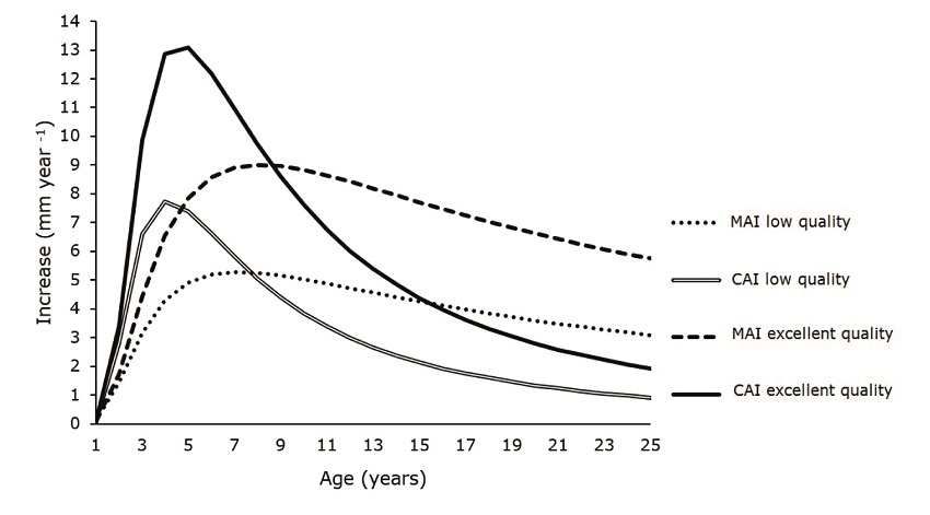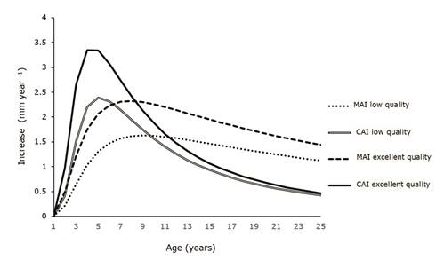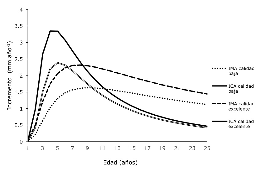 La intersección entre el ICA e IMA muestra el momento preciso en el que los incrementos son los óptimos; es decir, cuando el árbol alcanza los mejores rendimientos maderables (Martínez et al., 2014). Los sitios que difieren en calidades de estación presentan incrementos óptimos casi al mismo tiempo (calidad baja a los 8 años y calidad excelente a los 9 años), lo que implica que tienen un comportamiento similar. Sin embargo, los incrementos de madera temprana en sitios con calidad excelente fueron de 9 mm, a diferencia de los sitios con calidad baja que alcanzaron 5 mm (Figura 4). Sobre el particular, Pompa-García y Domínguez-Calleros (2015) indican que las buenas capacidades ecológicas del sitio impactan positivamente en el crecimiento de los árboles.