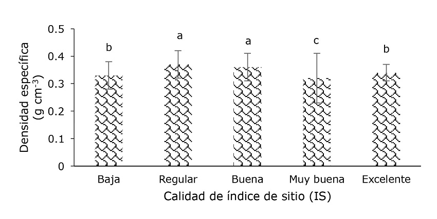 En el presente estudio se observa que los valores más altos de gravedad especifica están en calidades de sitio regular y buena (0.37 y 0.36 g cm-3, respectivamente); en contraste con las calidades excelente y muy buena (0.33 y 0.32 g cm-3) (Figura 3). Lo anterior sugiere que no existe un patrón definido; por lo tanto, los árboles ubicados en sitios con mejor calidad de estación (muy bueno y excelente) muestran crecimiento más activo y desarrollan madera de menor gravedad específica. Sin embargo, la calidad baja también mostró una gravedad específica baja, lo cual se explica a partir de que la calidad de sitio es la combinación de varios factores: clima, suelo, fisiografía, manejo, entre otros, y que alguno de ellos al presentar una variación en menor o mayor proporción, puede resultar en un crecimiento heterogéneo; por ubicarse en sitios de calidad de estación diferentes (Cuadro 2) (Mora et al., 2015). Además, se considera que la densidad específica baja de la madera, entre 0.32 y 0.37 g cm-3, es debido a que los árboles son jóvenes, de 21 años de edad, en los que gran parte de las células del tallo falta que aumenten el grosor de sus paredes celulares (López y Valencia, 2001). Lo anterior explicaría que los valores obtenidos sean inferiores al señalado por Vázquez-Cuecuecha et al. (2015), de 0.46 g cm-3 de densidad básica de la madera en árboles maduros de Pinus patula, con respecto a propiedades del suelo. Goche et al. (2011) coinciden con el mismo valor (0.46 g cm-3) en árboles de Pinus patula; sin embargo, discuten que la densidad de la madera varía dentro de las partes del árbol, entre individuos y especies, además de que es posible que esté influenciada por la edad, forma del árbol, diferencias genéticas, velocidad de crecimiento e historia evolutiva, entre otros (Jovanovski et al., 2005; Castillo et al., 2013).