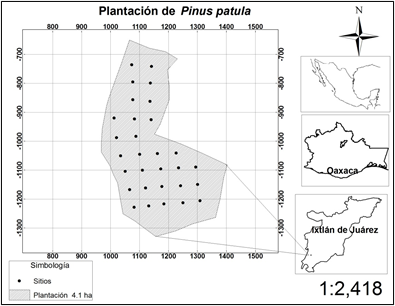 La investigación se realizó en una plantación de Pinus patula de 4.1 ha, ubicada a 12 km al noreste de Ixtlán de Juárez, Oaxaca, a 17°22’38.69’’ N y 96°28’44.8’’ O y a 2 550 m de altitud. El clima corresponde a C(w2) templado subhúmedo, la precipitación varía de 900 a 1 100 mm al año y la temperatura promedio anual es de 20 °C (Figura 1). La plantación fue establecida en 1995 en terrenos con pendiente de 16 a 42 %; del 2010 a la fecha no se han realizado aclareos y las densidades arbóreas son de 400 a 1 100 árboles ha-1; por lo tanto, existe una sobreposición de copas (Rodríguez-Ortiz et al., 2011).