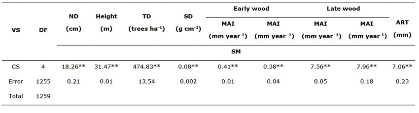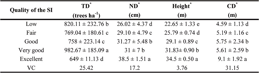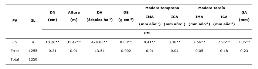 Las variables dasométricas y de crecimiento de los árboles resultaron altamente significativas (p ≤ 0.0001); es decir, el comportamiento de las variables evaluadas fue diferente con respecto a la calidad de sitio (Cuadro 1). Esto coincide con Martínez-Salvador et al. (2013), quienes al evaluar la productividad de tres calidades de estación para Pinus arizonica Engelm. y P. engelmannii Carr., en Chihuahua, registran diferencias significativas entre las calidades de estación (p < 0.05) en su efecto sobre la productividad de los árboles. Por su parte, Mollinedo et al. (2005) demostraron que los sitios con mayor productividad se aglutinan en escenarios donde la calidad es mejor (Jerez-Rico et al., 2011).