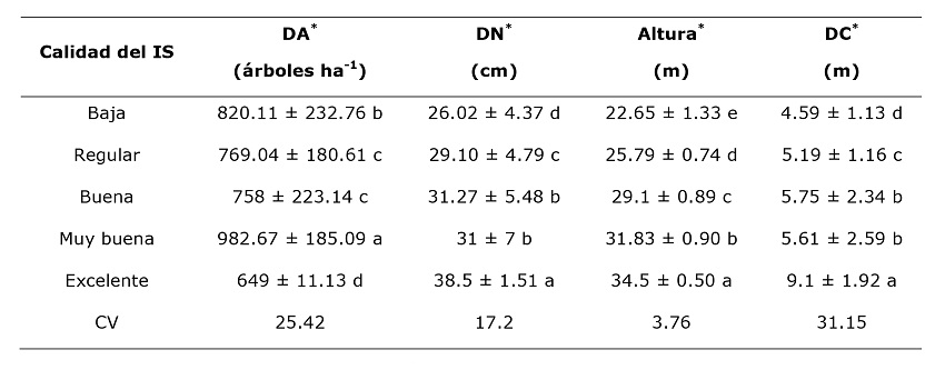 Las agrupaciones de la calidad de sitio se hicieron de acuerdo con el IS: calidad baja (IS≤24 m), calidad regular (IS>24, ≤27), calidad buena (IS>27, ≤30), calidad muy buena (IS>30, ≤33) y calidad excelente (IS>33). Para comparar el comportamiento de las variables dasométricas y de crecimiento en relación a la calidad de sitio, se realizaron análisis de varianza (p = 0.05), cuya variable clasificatoria fue la calidad de sitio, además se utilizó el método de medias de Duncan (p = 0.05) para observar las diferencias.