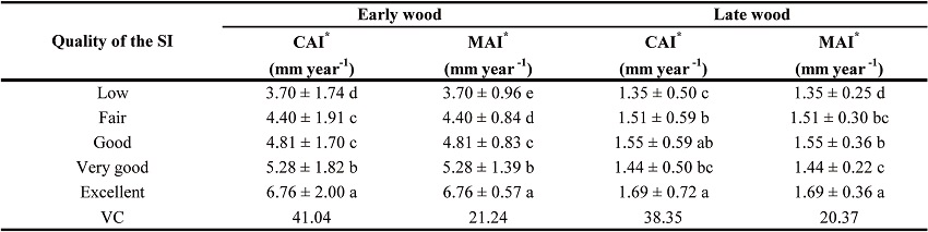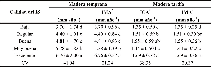 El IMA e ICA, con respecto a las calidades de sitio se comportan de manera ascendente; es decir, los incrementos en madera temprana y tardía aumentan a medida que la calidad mejora. Por ejemplo, el IMA de madera temprana para la calidad baja es de 3.7 mm año-1, mientras que en una calidad excelente es igual a 6.76 mm año-1, ambas fueron significativamente diferentes (Duncan, 0.05) (Cuadro 3). Una posible razón es que los árboles que se encuentran en calidades de estación mejores poseen copas de mayor tamaño y que, generalmente, conforman el dosel superior; por lo tanto captan mayor cantidad de luz solar (Interián-Ku, et al., 2014) (Cuadro 2). En este sentido, a medida que disminuya la calidad de estación, los recursos serán limitados, lo cual se reflejará en la dinámica de crecimiento del árbol (Mayo et al., 2008).