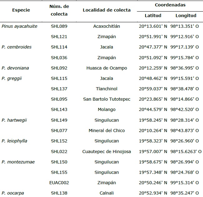 La colecta de ejemplares de Pinus se realizó en diversas localidades del estado de Hidalgo (Cuadro 1).