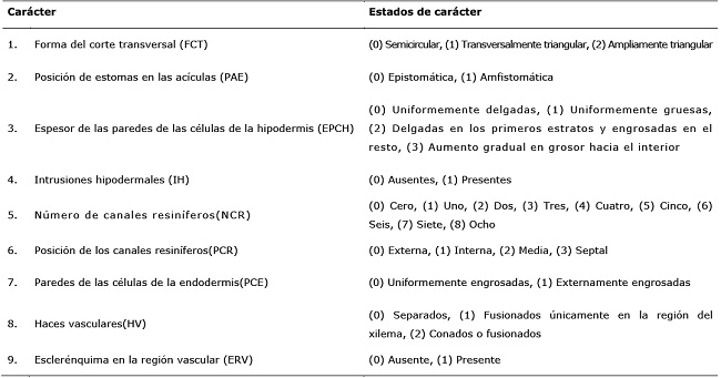 Mediante una revisión de la literatura y la observación de las preparaciones permanentes se establecieron nueve caracteres foliares y sus correspondientes estados de carácter, como se muestra en el Cuadro 2 (Coulter y Rose, 1886; Shaw, 1914; Martínez, 1945; Lanyon, 1966; Mirov, 1967; Farjon y Styles, 1997; Ortiz, 1999). Los caracteres y estados de carácter fueron descritos con observación de las preparaciones permanentes a diferentes aumentos, en un microscopio óptico Axioscope 40 (Carl Zeiss). Los cortes foliares se fotografiaron con un sistema de cámara digital acoplado al microscopio, y las imágenes se editaron en Adobe ® Photoshop ® CS6 Extended, versión 13.0.1 x32 (2017), para destacar los rasgos anatómicos foliares relevantes. Se construyó una matriz de datos morfoanatómicos a partir de las observaciones.