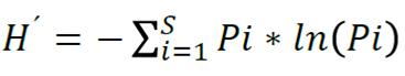 La diversidad se determinó a través del índice de diversidad de Shannon para cada comunidad (Shannon y Weaver, 1949), el cual es un algoritmo que describe dicho componente como independiente de la distancia y que refleja la heterogeneidad de una comunidad sobre la base de dos factores: el número de especies presentes y su abundancia relativa (Castellanos et al., 2008) (ecuación 1):