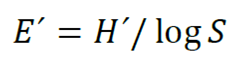 El índice de equidad se refiere al grado de dominancia relativa de cada taxon por sitio, que cuantifica la igualdad como la proporción de la diversidad observada en relación con la máxima diversidad esperada, cuyos valores varían entre 0 y 1; mientras más alto sea el índice, mayor igualdad de las especies. Se calcula de acuerdo con Pielou (1966) con la siguiente expresión matemática (3):