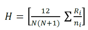 El análisis de la composición estructural consideró la comparación de la distribución de las categorías diamétricas, y para determinar si hay diferencias significativas en la diversidad y en la estructura arbórea entre los cuatro gradientes altitudinales, se utilizó la prueba no paramétrica de Kruskal-Wallis (ecuación 5) (Kruskal y Wallis, 1952), con la hipótesis nula de igualdad de medianas y con un nivel de significancia de 95 %; esto se debe a que, previamente, los datos fueron sometidos a pruebas de normalidad de Kolmogorov-Smirnov (K-S), los cuales no presentaron una distribución normal.