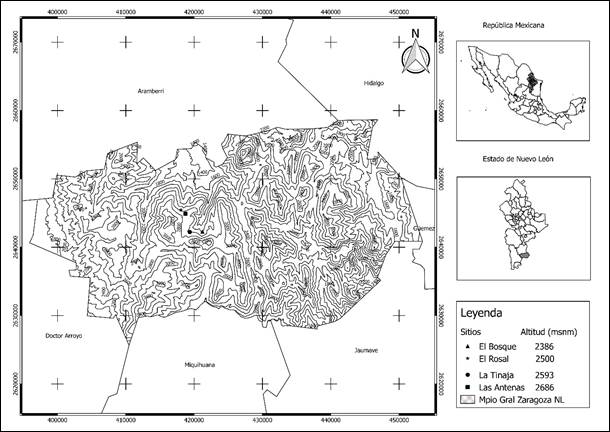 Se seleccionaron masas forestales con presencia de Abies vejarii en el ejido La Encantada del municipio General Zaragoza estado de Nuevo León, México, que se localiza en las coordenadas 23°54’18.36’’ norte y 99°47’44.04’’ oeste, en un intervalo altitudinal de 2 400 a 2 700 m. Los datos se obtuvieron de cuatro sitios denominados por el paraje de ubicación (Figura 1).