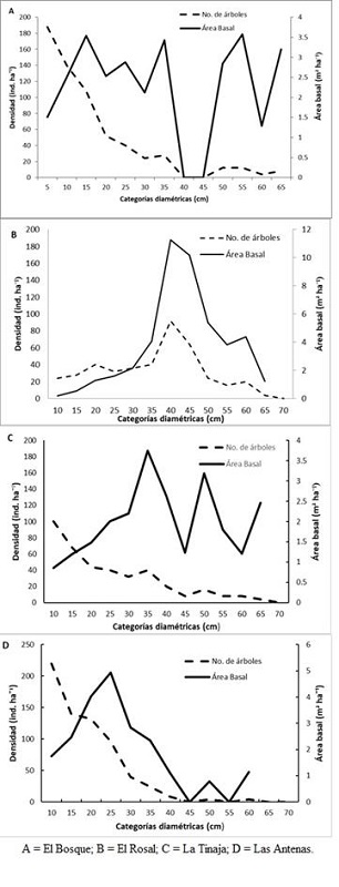 La distribución del arbolado en las diversas categorías diamétricas describe las características de un bosque maduro sin manejo en tres de los cuatro sitios, donde se concentra el número más alto de árboles en las clases diamétricas menores, pero la mayor dominancia por área basal corresponde a las categorías superiores (Figura 3). Estas características son atribuibles a la alta competencia y a la intolerancia a la sombra de algunos taxa (Castellanos et al., 2008).