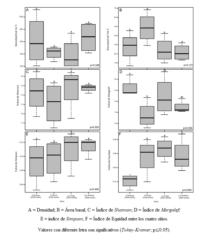 Sin embargo, y aunado a lo anterior, la prueba de Kruskal-Wallis muestra que la diversidad y la estructura de los rodales no tuvieron diferencias estadísticas significativas entre los intervalos de altitud (p>0.05), excepto en el índice de Margalef que fue ligeramente inferior en los rodales de mayor altitud (p<0.05), lo que indica que sí hubo una diferencia significativa en la riqueza de especies en el intervalo altitudinal (Figura 4). Probablemente, este patrón se explica porque las especies que se desarrollan en diferentes altitudes experimentan diversas condiciones ambientales y a factores como la edad de los árboles, el tipo de rodal en función de la composición de las especies arbóreas o el efecto de las copas de los árboles que inducen presiones de selección contrastantes que conducen a la diferenciación o aclimatación entre las poblaciones (Sagar et al., 2008; Smith et al., 2008; Coote et al., 2013; Latreille et al., 2017).