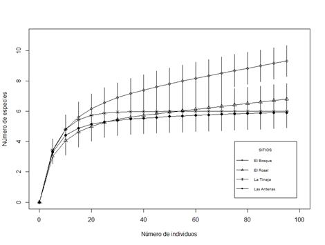 El análisis de las curvas de rarefacción de las especies estimadas para el gradiente altitudinal presentó asíntota en nueve aproximadamente; en general, se necesitaron 97 individuos para lograr la riqueza máxima y en los intervalos de confianza hubo una superposición en tres parcelas, por lo que no presentaron diferencias significativas en la riqueza. La comunidad de El Bosque estuvo, ligeramente, por encima de los tres sitios; es decir, hay una mayor concentración de la riqueza en la localidad más baja de 2 386 msnm (Figura 5).