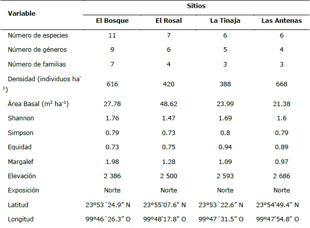La densidad de especies arbóreas fue diferente a lo largo del gradiente altitudinal; la más alta se determinó en el sitio Las Antenas (668 individuos ha-1) y la más baja en La Tinaja (388 individuos ha-1); estos valores son comparables con los de otros autores en bosques templados del noreste de México. Jiménez et al. (2001) con 297 individuos ha-1; Aguirre et al. (2003), 420-777 individuos ha-1; Návar (2010), 424-700 individuos ha-1; Ávila et al. (2012), 150-185 individuos ha-1; y Hernández et al. (2013) 716-940 individuos ha-1. El área basal calculada fue de 21.38 m2 ha-1 a 48.62 m2 ha-1 y la media para los cuatro sitios fue de 30.44 m2 ha-1 (Cuadro 3).