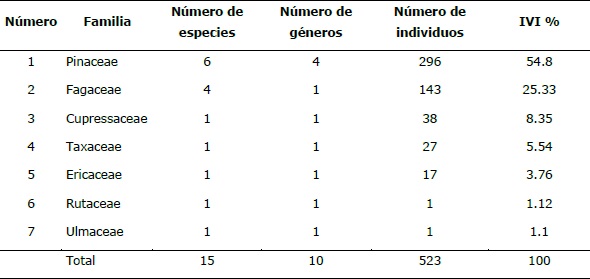 En general fueron siete familias de árboles taxonómicamente bien representadas en el área de estudio. Pinaceae tiene el máximo de las especies (seis), seguido de Fagaceae (cuatro); Cupressaceae, Ericaceae, Rutaceae, Taxaceae y Ulmaceae tuvieron solo una especie. Sobre la base de la densidad, Pinaceae contribuyó con 56.5 %, seguida de Fagaceae (27.3 %), Cupressaceae (7.2 %), Taxaceae (5.16 %) y Ericaceae (3.25 %). Para el índice de valor de importancia, Pinaceae aportó 54.8 %, Fagaceae (25.33 %), Cupressaceae (8.35 %), Taxaceae (5.54 %) y Ericaceae con 3.76 % (Cuadro 2). Aunado a lo anterior, Valdez et al. (2003) describen una localidad en Nuevo León a 2 100 msnm, en donde se presenta una asociación caracterizada por Picea martinezii T. F. Patt, Cornus florida L., Ilex rubra S. Wats, Quercus greggii (A. DC.) Trel., Abies durangensis var. coahuilensis (I. M. Johnst.) Martínez, Carya ovata (Mill.) K. Koch y Taxus globosa Schltdl.