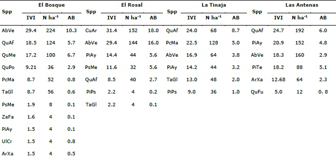 El número de especies arbóreas en este estudio fue similar al citado por varios autores en bosques templados con Abies, que fluctó entre 5 y 13 (Encina et al., 2008; García et al., 2012; Ávila et al., 2012; Guerrero et al., 2014). La diversidad estuvo influenciada por la estructura del bosque y la composición de las especies (FAO, 2010b).