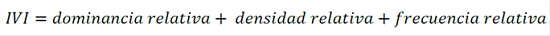 El IVI consiste en la suma de los valores relativos de densidad, frecuencia y dominancia; fue desarrollado por Curtis y McIntosh (1951). Es un índice sintético estructural, orientado, principalmente, a jerarquizar la dominancia por especie en rodales mezclados y se calcula como se indica: