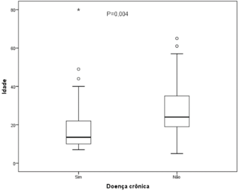 Dos 145 pacientes, 69% dos pacientes não faziam o uso de medicação, 21,4% faziam e 9,7% faziam o uso de duas ou mais medicações. Correlacionando com a idade, a mediana foi de 22 anos para os pacientes que faziam o uso de medicação (intervalo interquartil de 11 a 35 anos) e para os pacientes que não faziam o uso foi de 24 anos (intervalo interquartil de 19 a 33 anos) (p=0,137).