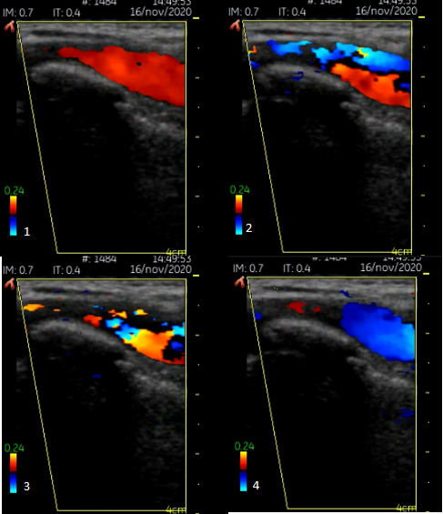 En la misma consulta se realiza una ecografía con ecógrafo de bolsillo y sonda de alta frecuencia (7,5 MHz): se observa flujo turbulento bicolor al aplicar el Doppler, con formaciones irregulares rodeando luz (Figura 2).