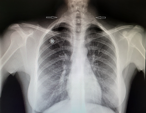 Posteriormente, llegada la cita, el Servicio de Radiología realiza un ecodoppler de troncos supraórticos y revisa placa de tórax, donde observa costilla cervical bilateral (Figura 3). Al realizar el estudio ecográfico dirigido al hueco supraclavicular izquierdo se identifica una arteria subclavia izquierda posterior a la primera costilla cervical, discretamente más dilatada que la derecha, pero sin imágenes aneurismáticas ni signos de complicaciones vasculares. Se trata de una variante anatómica sin significación clínica en la actualidad, pero de la que conviene conocer su existencia ya que a lo largo del tiempo podría presentar sintomatología asociada al síndrome del desfiladero torácico por compresión del plexo braquial, vena o arteria subclavias.