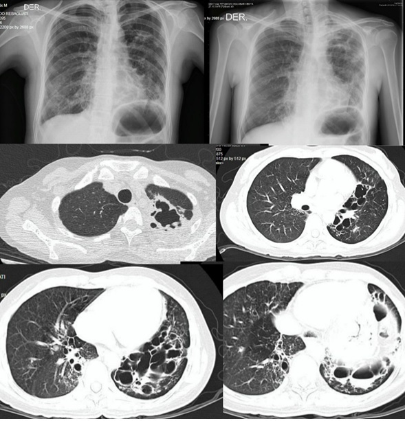 The patient was a 44-year-old woman, a native of the Department of Huancavelica (3,676 meters above sea level) in the Peruvian highlands, presenting nearly 40 years of respiratory symptoms including: cough, phlegm, and dyspnea. At the age of 30, she was diagnosed with a pulmonary sequela due to untreated tuberculosis after several previous radiographs showed lung lesions of the bronchiectasis type. For several years, only sputum samples were requested in search of M. tuberculosis, all of which were negative. The general examinations did not show striking alterations. Chest tomography showed initially diffuse bilateral cystic bronchiectasis that was later located predominantly in the upper and lower left lobe and the lower right lobe (Figure 1). The paranasal sinuses showed no alterations. No fungal microorganism was isolated.