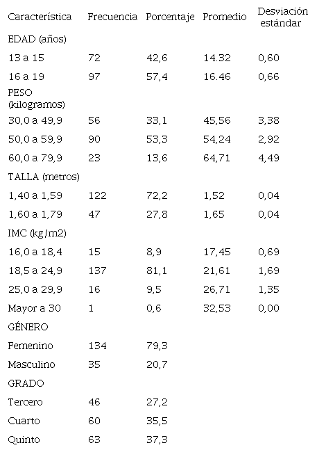 Los resultados corresponden a 169 adolescentes escolares. De los cuales 134 (79%) eran mujeres, con una edad promedio de 14,42 años (13 a 19 años), las características demográficas pueden encontrarse en la tabla 1.