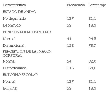 La relación entre el género y la depresión en adolescentes fue estadísticamente significativo (p=0,028). En relación a la disfunción familiar y la depresión en adolescentes se encontró 41 (24,3) adolescentes sin disfunción familiar y 128 (75,5) adolescentes con disfunción familiar. Entre estas variables se encontró asociación estadísticamente significativa (p=0,037). Con respecto a la percepción de imagen corporal y la depresión en adolescentes se encontró 54 (32%) adolescentes sin alteración de la percepción y 115 (68%) adolescentes con alteración de la percepción de imagen, con asociación estadísticamente significativa (p=0,020), el resto de asociación puede encontrarse en la tabla 3.