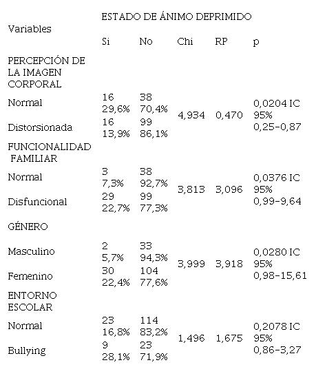 Abstract: OBJECTIVE: To determine the relationship beetwen depression and three associated factors (family dysfunction, distorted body image and bullying) in adolescents from a school of Huánuco City in Perú, October 2016. METHODS: Cross-sectional analytic study in a stratified random sample of 169 adolescents who were in third to fifth grades of high school. Reynolds Adolescent Depression Scale (RADS) was applied to measure dependent variable and other questionnaires were applied for associated factors. RESULTS: 18,9% of the students presented depression; family dysfunction was observed in 75,7%; 68% presented distorted body image; 18,9% showed bullying; 5,7% of the men and 22,4% of the women evidenced depression. The following associated factors presented a meaningful connection with depression: family dysfunction (p=0,037), distorted body image (p=0,020) and gender (p=0,028). CONCLUSIONS: This study showed that an important percentage of adolescents suffer depression. The most outstanding associated factors were distorted body image and family dysfunction. No significant relationship between depression and bullying was found.