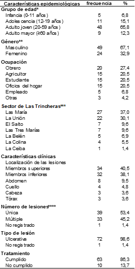La mayoría de los afectados con LTA son adultos jóvenes (20-59 años) (66,3%) y del género masculino (66,3%), obreros (26,3%) y fundamentalmente residenciados en los sectores Las Marías (37% [27/73]) y la Unión (30,1% [22/73]) (tabla 1).