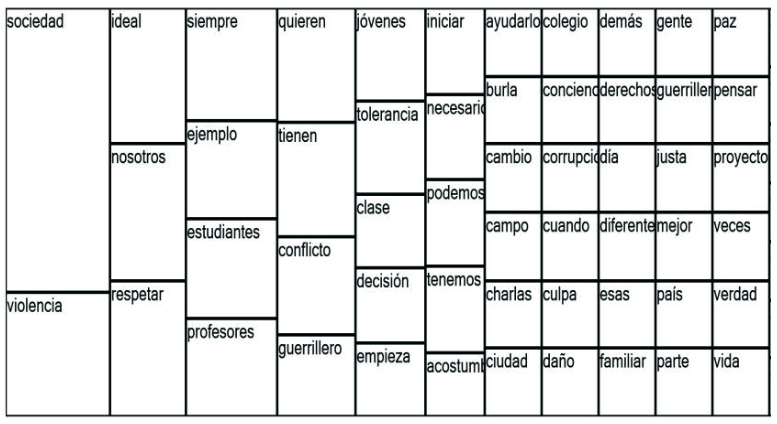 De acuerdo a lo observado en el mapa de nube y en el árbol de palabras, otro elemento característico de las representaciones sociales del postconflicto fue la idea de posibilidad de cambio y posibilidad de construcción intersubjetiva de una nueva realidad nacional que surge como apuesta categóricamente a los antivalores del pasado y del presente en transición. De ahí que, ante el conflicto permanente se opone la paz estable y duradera, ante la violencia, el consenso democrático de fuerzas contrarias que se respetan más allá de sus profundas diferencias, ante la precariedad y la pobreza de muchos, la posibilidad de alcanzar una sociedad más equitativa y prospera para las mayorías.