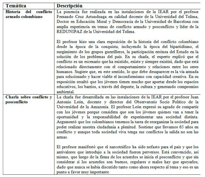Se realizaron jornadas de socialización y discusión respecto a las lecturas. De igual modo, se efectuaron actividades que involucraron lecturas, participación en charlas y foros sobre temas relacionados con paz, conflicto y posconflicto, las cuales se describen sucintamente a continuación: