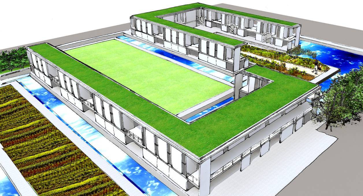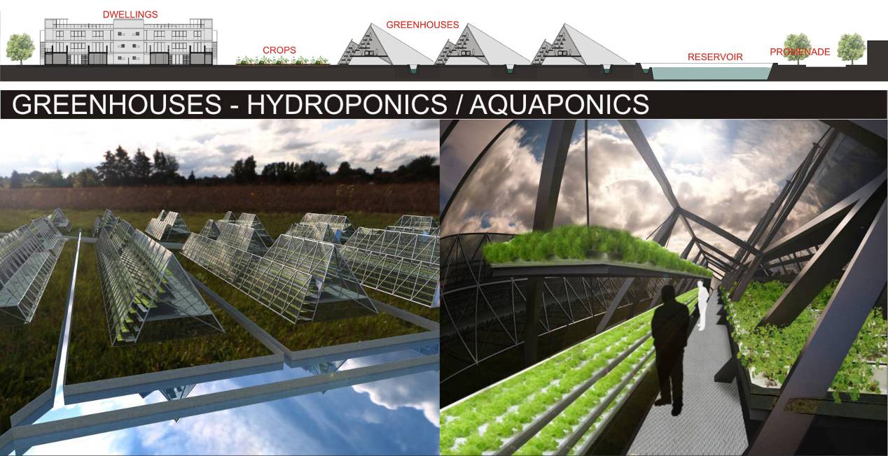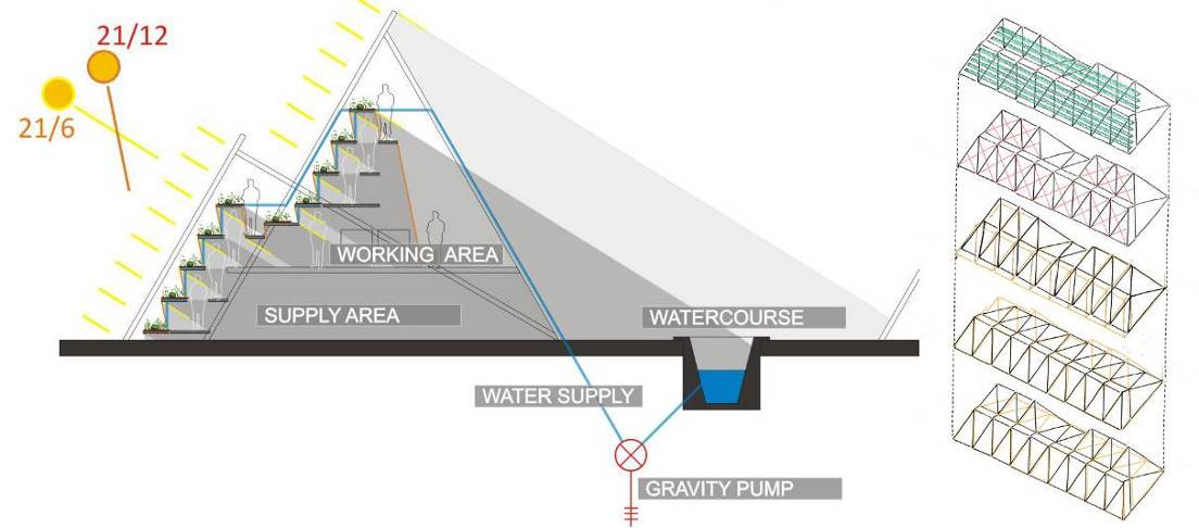 Las áreas vacantes de la la cuenca del arroyo, son reinterpretadas para la realización de Huertas Verticales, 2 sobre un sistema de invernaderos modulares lineales despegados de la cota de inundación, con una incidencia mínima en el apoyo sobre el terreno natural, preservando su condición de bañado, sin interrumpir el drenaje natural. Los invernaderos se orientan de modo tal que obtengan un máximo asoleamiento, y tanto la inclinación de su frente como el desplazamiento de las bandejas de cultivos responden al estudio del máximo aprovechamiento de la captación de luz natural, generando espacios de trabajo, de acopio y abastecimiento por debajo de los mismos. Se desarrollan a partir de un sistema de invernaderos en altura, como espacios de producción e investigación en técnicas de hidroponía y cultivos en altura, prescindiendo del uso de la tierra, y permitiendo que el suelo sea inundable. Se alimentan a partir de un sistema de canales y bombas de gravedad que evitan el uso de energía. 1 (Distasio, 2016)(Vyawahare, 2016)(Despommier, 2010)