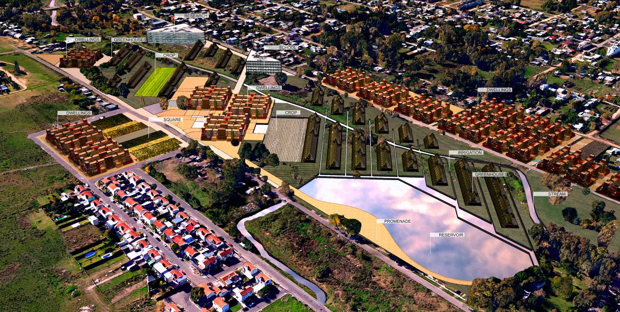 - El diseño general resuelve las transiciones con la trama existente, la optimización de orientaciones para el caso de los invernaderos, la relación del cultivo con el agua y la delimitación de espacios públicos no productivos, integrando a la vivienda a este sistema. El valor paisajístico del conjunto jerarquiza a los elementos productivos y se sintetiza a partir del trazado geométrico general. Cada elemento del conjunto (vivienda, invernadero, cultivo) tiene su propia especificidad formal, que a pesar de su autonomía se subordina al diseño general de las propuestas, que permita la intervención de proyectistas diferentes en cada uno de ellos.