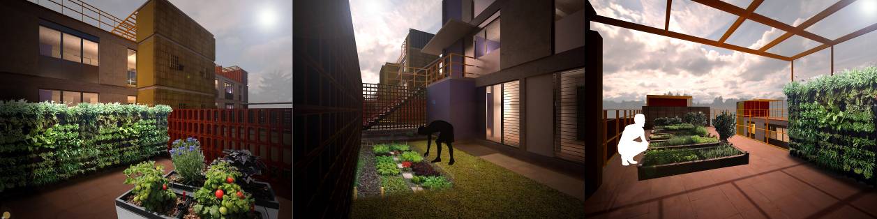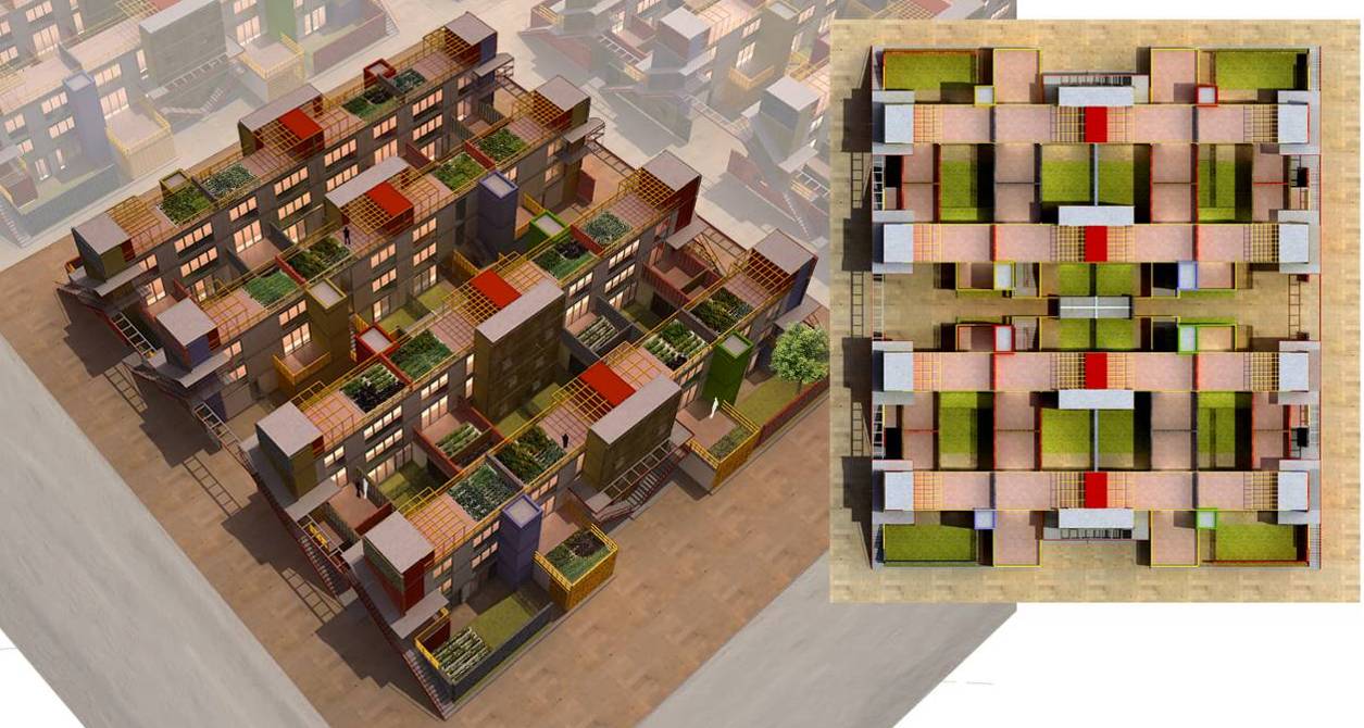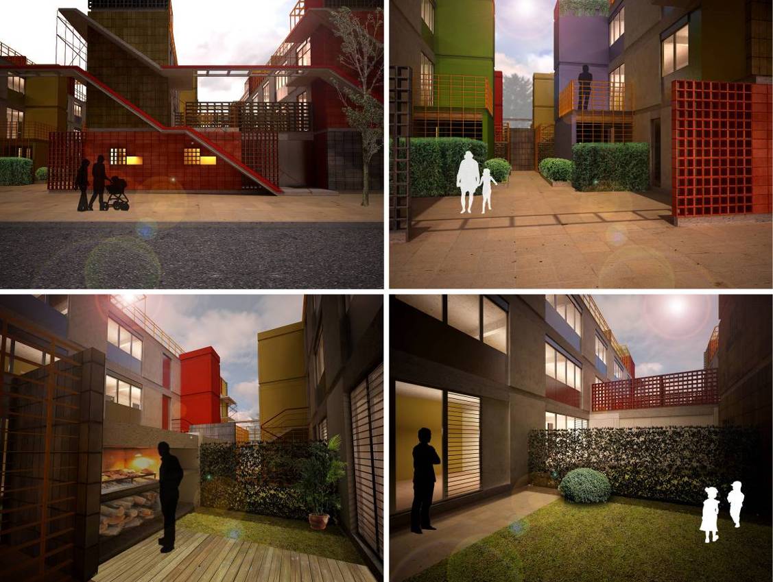 Vivienda: Es una propuesta de vivienda colectiva de bajo costo, densidad media, baja altura y porosa, que propone casas con terrazas propias en 3 niveles, articulando espacios de producción doméstica y lugares de esparcimiento. Se proponen accesos independientes y ausencia de ascensores, evitando consorcios de copropietarios y reduciendo gastos de mantenimiento