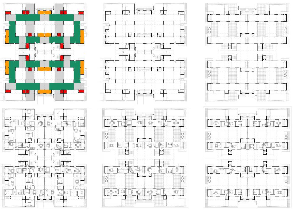 - Estudio y desarrollo de las viviendas: Desde la arquitectura, es un desafío constante la búsqueda de viviendas de bajo costo, sin renunciar a la calidad ambiental, la flexibilidad y la calidad constructiva de las mismas, para lograr que sean accesibles, perdurables y adaptables a los cambios de sus habitantes. La vivienda colectiva permite además proponer modelos de ciudad más densificada, y por lo tanto más eficientes y sostenibles en el tiempo. Estos aspectos del problema conforman parte de la agenda de dificultades a resolver, que podrán enriquecerse de las disciplinas intervinientes en particular, y desde la necesaria coordinación de los intereses y aspectos particulares en la visión general de una propuesta de proyecto urbano, entendido este como herramienta y como forma de abordar los problemas de la ciudad, y como conductor de las acciones y estrategias a realizar. Las cuestiones hasta aquí enunciadas, intentan dar cuenta de la multiplicidad y complejidad de temas que exceden a los alcances del propio proyecto de arquitectura, y que no pretenden ser resueltos desde el mismo sino que requieren el abordaje de otras especificidades disciplinares. Las dos exploraciones proyectuales presentadas sitúan al proyecto como articulador y conductor de las acciones a implementar desde una propuesta específica. Es posible llegado este punto, realizar consideraciones respecto al propio proyecto y a los aspectos del problema que éste puede abordar