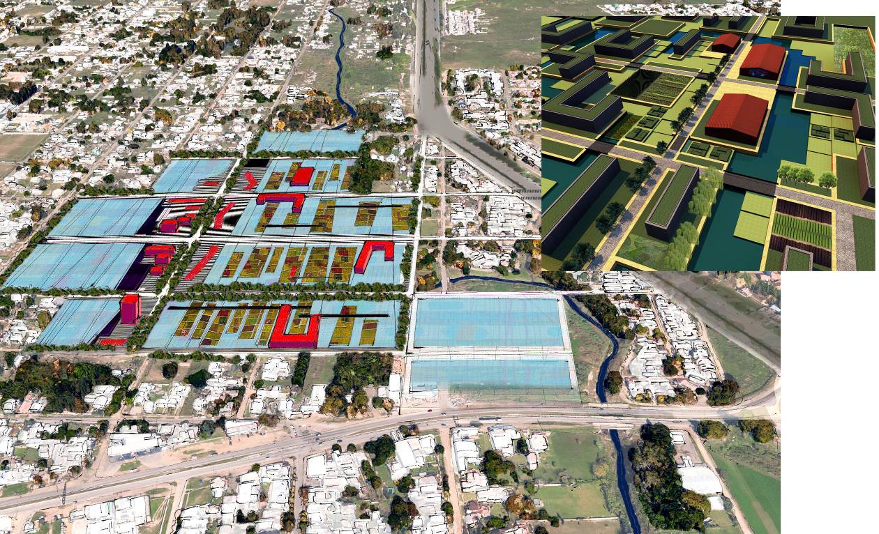 Los sectores de cultivo están planteados a cielo abierto y dentro de invernaderos, proponiendo además edificios comunitarios que generan valor agregado a la producción primaria: edificios educativos, ferias para el comercio y un sistema de espacios públicos que integra toda el área. (Figura 7). Los sectores de cultivo se organizan a partir de un sistema de huertas comunitarias, donde las relaciones sociales, la colaboración, las experiencias y la innovación en técnicas de cultivo son fomentadas por la propia actividad productiva. Las nociones sobre eco-ingeniería son investigadas para incorporar soluciones que respeten el medioambiente, e incorporen los recursos con los que cuenta el área de intervención, intentando adaptarse mejor a las condiciones y posibilidades del contexto.