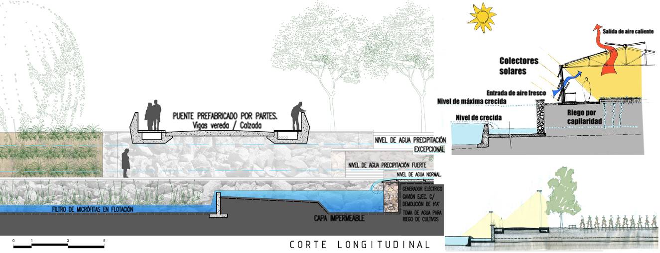Se busca revitalizar el sector más degradado, a partir de un conjunto de plaza seca equipada con una plaza verde, definidas por conjuntos de viviendas a cada extremo de las mismas, y articuladas con un paseo recreativo lineal que acompaña el recorrido de la calle y recorre e integra todo el conjunto, buscando la cualificación del sector a partir de un espacio público atractivo y convocante, que pueda ser sede tanto de actividades culturales como de ocio, y albergar usos requeridos por la comunidad. 3 Este espacio también tiene una conexión directa, hacia la otra margen del arroyo, con un conjunto de edificios de educación e investigación dependiente de la Universidad, orientado al desarrollo de agricultura urbana y cultivos en altura, con los invernaderos y los espacios exteriores de las viviendas como ámbitos de estudio.