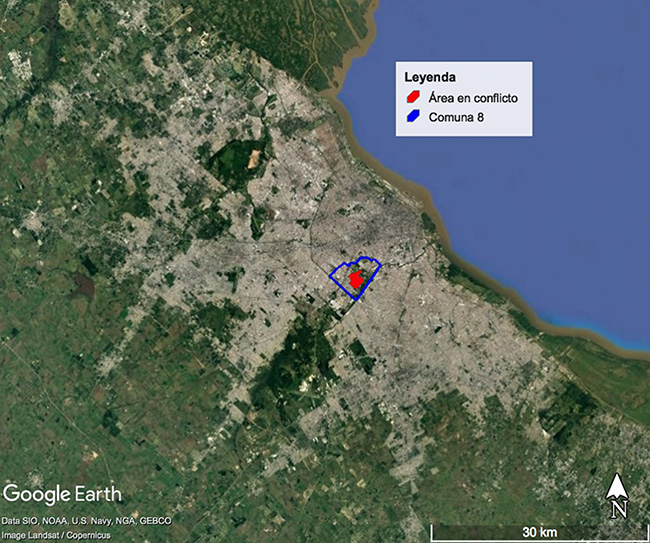 La Comuna 8 está localizada en el sur de la ciudad de Buenos Aires. Se caracteriza por tener bajas densidades; un tejido discontinuo y atravesado por barreras urbanas; un stock industrial en desuso y declive de la actividad económica; y por concentrar la mayor cantidad de villas y vivienda social de la ciudad 2. Pero también presenta cierta disponibilidad de terrenos fiscales y una localización central en el Área Metropolitana de Buenos Aires (Figura 1). El proyecto de emplazar un Polo Farmacéutico se inserta en la política de desarrollo del sur, que en este periodo se orientó a la expansión del mercado en el área. En el caso analizado esto se observa en el surgimiento de una modalidad de desarrollo conducida por el mercado; un avance de los sectores empresariales en la definición de intervenciones de política urbana; y en la privatización de terrenos fiscales, que tenía como contracara la desposesión de los habitantes de Villa 20.