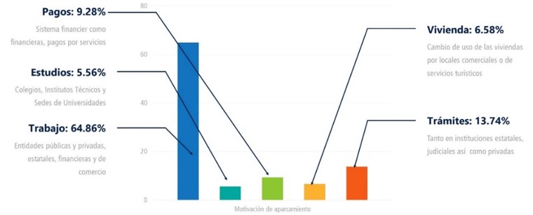 Del levantamiento de campo en la presente investigación se desprende que el 64.86% de vehículos aparcados se debe a actividades laborales, mientras que el 13.74% los realiza por trámites administrativos ante entidades públicas y privadas y el 9.28% debido a transacciones financiera. Además, se encontró que el 49% de vehículos aparcados, corresponde a tipología de autos, el 28% camionetas, 5% camiones de carga y 5% a motocicletas.