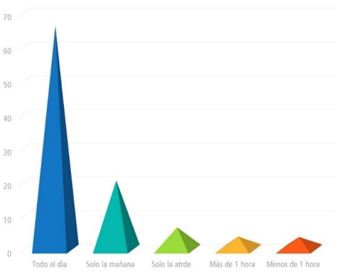 Otro de los indicadores con mayor relevancia en la investigación está determinado por el tiempo de ocupación de los espacios de estacionamientos que nos da mayores luces de la movilidad vehicular en las calles donde existe dichos espacios de aparcamiento. Así se puede observar que más del 60% de ocupaciones se realizan por periodos de tiempo de ocho a más horas, esto quiere decir que este grupo de personas concurre a estos espacios a inicios de la jornada laboral (7.00 am) y al ser gratuito el aparcamiento, dejan sus vehículos hasta el final de sus labores como se aprecia en la figura 07.