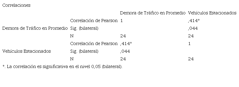 Para verificar la hipótesis Hi: El tráfico vehicular se asocia a la cantidad de vehículos estacionados en la ciudad de Cusco en el 2020, el nivel de significancia establecido fue de ? = 5% (0.05), con un nivel de confianza al 95%. Aplicando la prueba estadística r de Pearson, por tratarse de variables cuantitativas continuas, obteniendo los siguientes resultados.