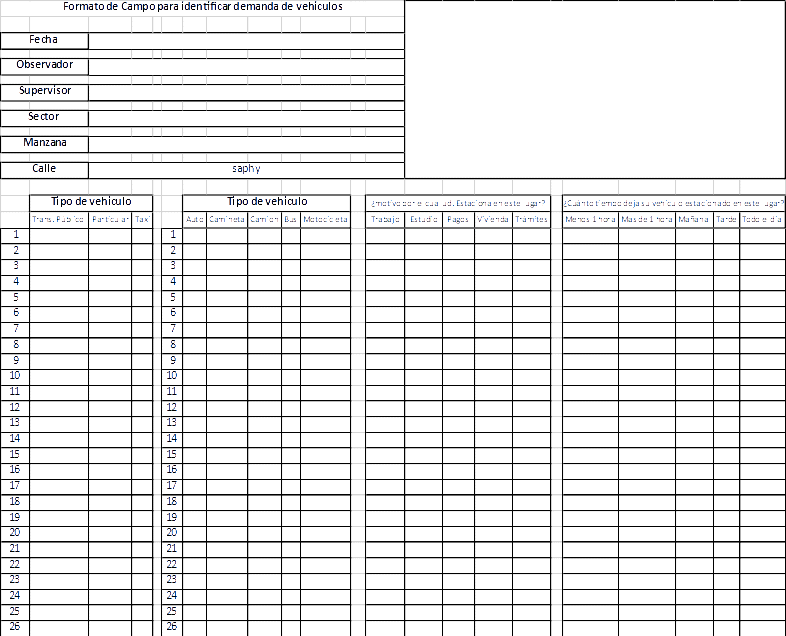 Además, dicha ficha permito establecer los datos descriptivos de la variable y así comprender de mejor manera las características de los vehículos, así como de los espacios de aparcamiento, sean o no permitidos para determinar la oferta real de espacios de aparcamiento y la frecuencia de uso de los mismos. Cabe mencionar como el enfoque metodológico es mixto, también se aplicó la entrevista semi estructurada para identificar las motivaciones por las que los conductores deciden estacionar en el centro histórico y bajo el conocimiento de la ilegalidad de ciertos espacios de aparcamiento. Esto nos permitió comprender las características socioculturales de la población de estudio.