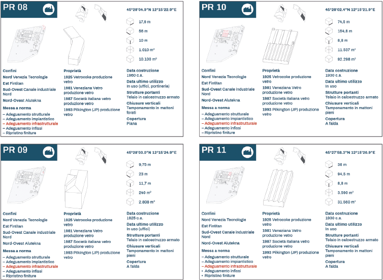 Esta investigación proporciona los datos necesarios para definir los parámetros de selección de los puntos neurálgicos donde poder implantar una posible (y plausible) acción de recomposición del distrito veneciano. 13 puntos focales seleccionados: edificios y / o áreas libres y en estado de abandono. Los que tienen en común: la presencia o la proximidad (distancia máxima: 500 m) a un edificio testimonio de la civilización industrial; el 75% de estos puntos tienen una relación directa con el agua; los puntos son atendidos por las infraestructuras existentes; el 75% de las áreas seleccionadas tienen proyectos de saneamiento aprobados y los niveles de contaminación están mapeados y comprobados (el resto de las áreas no han participado en los planes de caracterización). Se ha identificado un número suficiente de puntos para hacer sistema: un punto cada 1.5 km2 o menos (se va fácilmente a pie y en bicicleta).