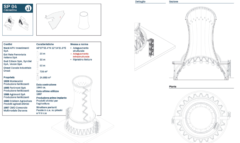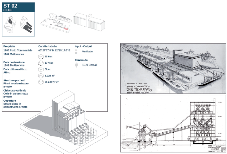 Figura 10: A el análisis morfológico y funcional, siguió un estudio tipológico, para entender las vocaciones (pasadas y planeadas) y obtener un conocimiento más profundo del patrimonio arquitectónicos, urbanístico, histórico, o sea cultural de Porto Marghera. Ejemplo de una hoja de catálogo, capitulo “edificios para el deposito”: Edificios verticales: silos.