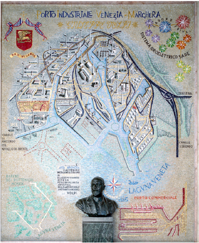 Encargado por SADE, el mosaico se ubica en el atrio del edificio de la oficina termoeléctrica G. Volpi. En el panel está una cita de Volpi: « Porto Marghera es el futuro seguro para Venecia y su mayor defensa para la seguridad artística de las antiguas islas que tanto amamos.» [È Porto Marghera l’avvenire sicuro per Venezia e la sua piú grande difesa per l’incolumità artistica delle antiche isole che tanto amiamo]. verdaderos descubrimientos que se deben a los instrumentos (fuentes, normas, inspecciones, planos digitales) y, en la misma medida, al ojo del observador. El Atlas concretiza una investigación de morfemas extrapolados y casi totalmente autónomos con respecto al fenómeno observado. El Atlas propone una lectura procedimental del sitio, aunque resulte ser altamente interpretativa, y aspira a la activación de las sugerencias analógicas que activen los “retentissement”2, es decir los fenómenos de reidentificación de principios formales: figuras que participan de la cultura del investigador. Imágenes presentes en la propia conciencia y que, gracias a las combinaciones permutativas propuestas en el Atlas, puedan encontrar una correspondencia también en el lector. El retentissement pone en marcha la actividad “creativa” del lector, que se identifica con el escritor: