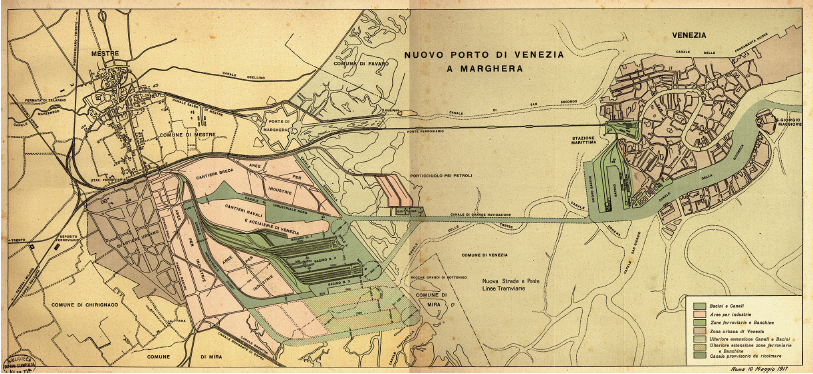 El Plan General de Ordenación en 1956 se puso en acto en 1963, cuando se dispuso que en Porto Marghera podrían instalarse establecimientos contaminantes, aunque en los hechos esto ya había pasado6.